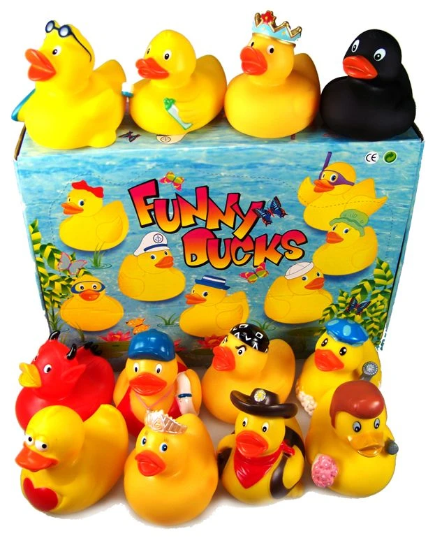 Mit dem Set bekommst Du Deine Badewanne voller quietschender Badeenten. Im Set sind 12 lustige Quietsche-Entchen Funny-Ducks mit jeweils ca. 8cm Größe: Badeente mit Lesebrille, Badeente mit Tube, Badeente König, Die schwarze Badeente, Badeente Teufelchen, Bauarbeiter Badeente, Badeente Pirat, Badende Badeente, Verliebte Badeente mit Herz, Prinzessinnen Badeente, Cowboy Badeente und Badeente Verehrer.