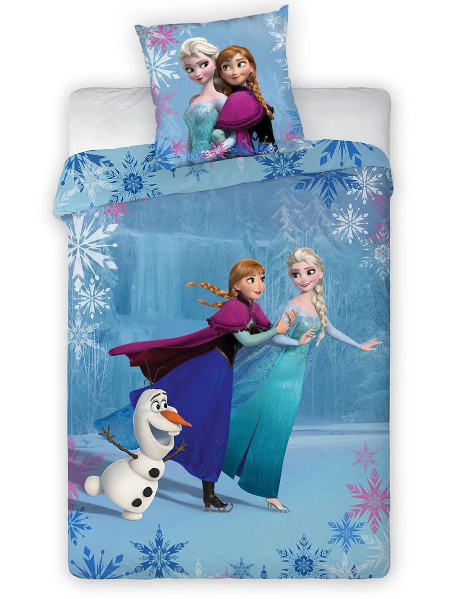 Hochwertige Bettwäsche zum Kinofilm “Die Eiskönigin – Völlig unverfroren” mit dem Motiv von Anna, Elsa und Olaf auf dem Eis.