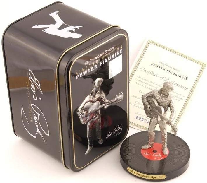 Die limitierte Zinnfigur zeigt Elvis bei seinem TV-Auftritt -68 comeback special- (NBC-TV Special). Zusätzlich zu der Figur bekommt der Elvis Fan eine Tindose und ein Echtheitszertifikat mit Seriennummer.Die Tindose ist zusätzlich mit einem Elvis-Hologramm versehen. Elvis Zinnfigur mit einer Schallplatte als Base, Elvis Tindose mit Hologramm, Echtheitszertifikat Pewter Figurine mit Seriennummer, Limitiert auf 10000 Stück, Maße der Tindose: ca. 17,5cm x 11cm x 11,5cm.