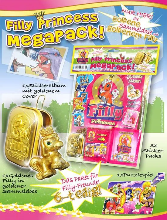 Sechsteiliges Filly Princess Megapack mit einem goldenen Filly Pony. Das Megapack enthält: 1x Stickeralbum mit goldenem Cover, 3x Stickertüten, 1x Filly Mini-Puzzle (54 Teile) und 1x goldenes Filly in einer goldenen Sammeldose (Tin).