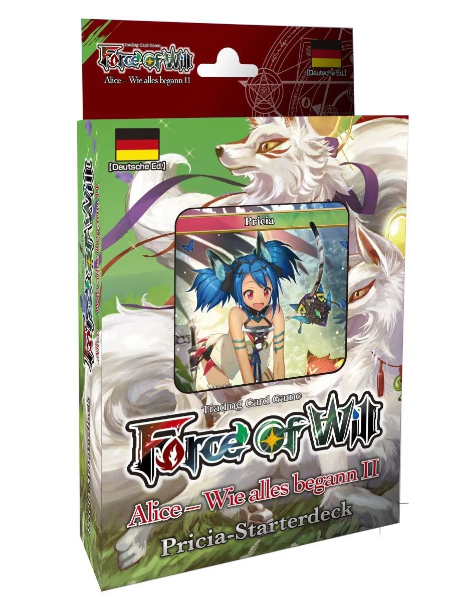 Das Force of Will Starterdeck Pricia zur Edition “Alice – Wie alles begann Teil 2” in Deutsch enthält eine Spielunterlage, zwei Spielanleitungen und insgesamt 61 Karten:
