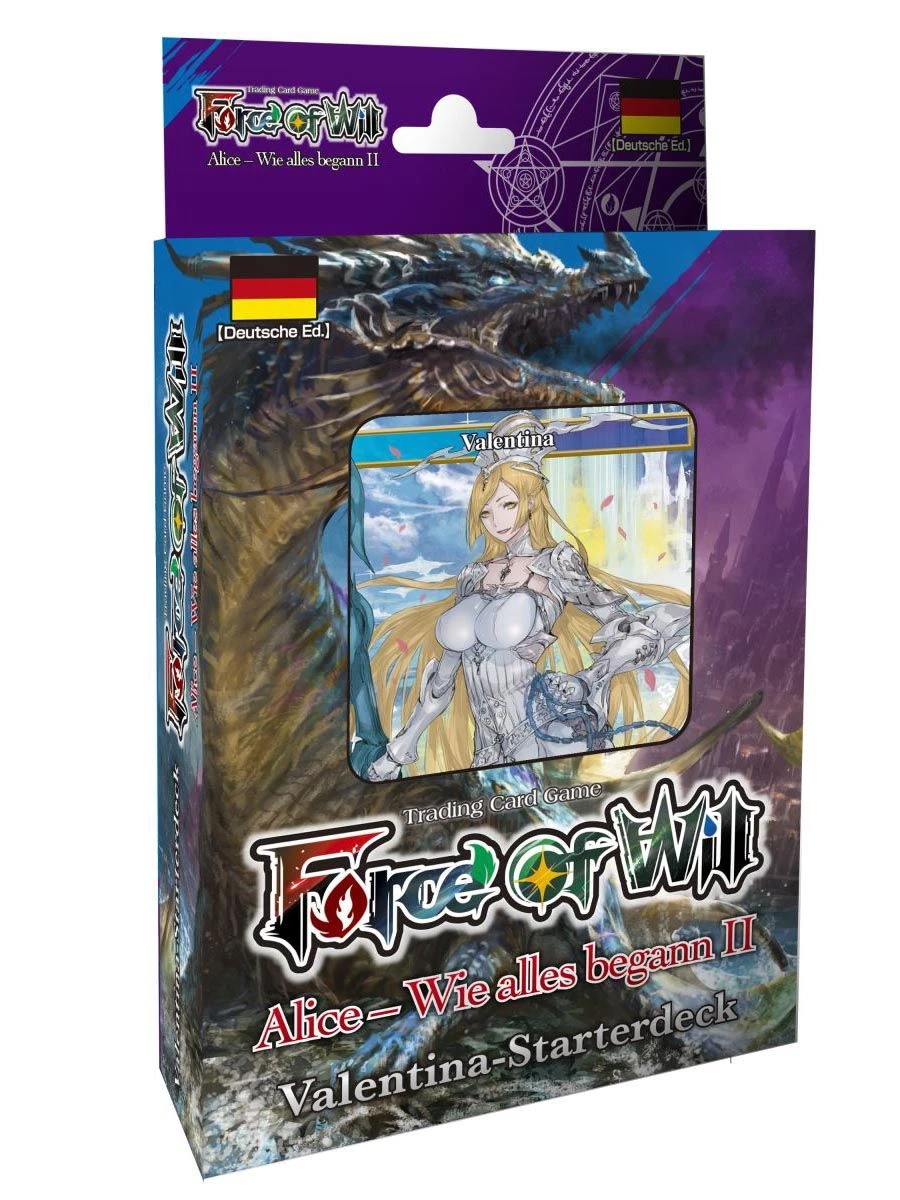 Das Force of Will Starterdeck Valentina zur Edition “Alice – Wie alles begann Teil 2” in Deutsch enthält eine Spielunterlage, zwei Spielanleitungen und insgesamt 61 Karten: