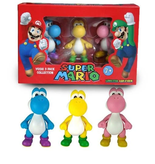 Yoshi Figuren aus Nintendos Konsolengame Super Mario in drei Farbvariationen: Blau, Gelb und Rosa. Größe: jeweils ca. 5,5cm, Limited Edition, Verpackung: Windowbox