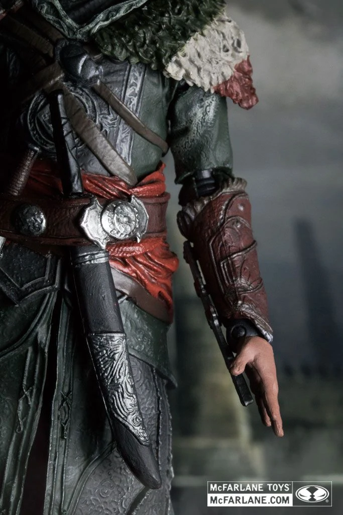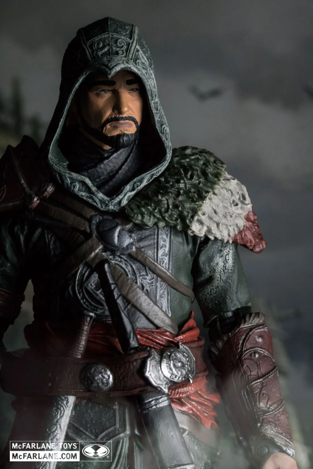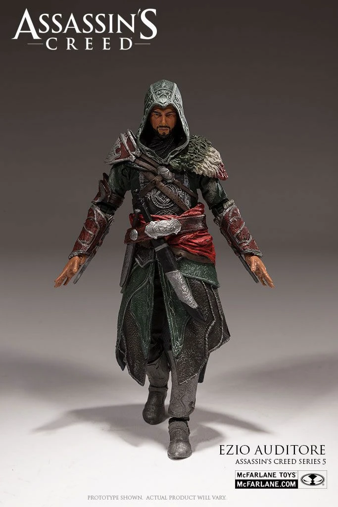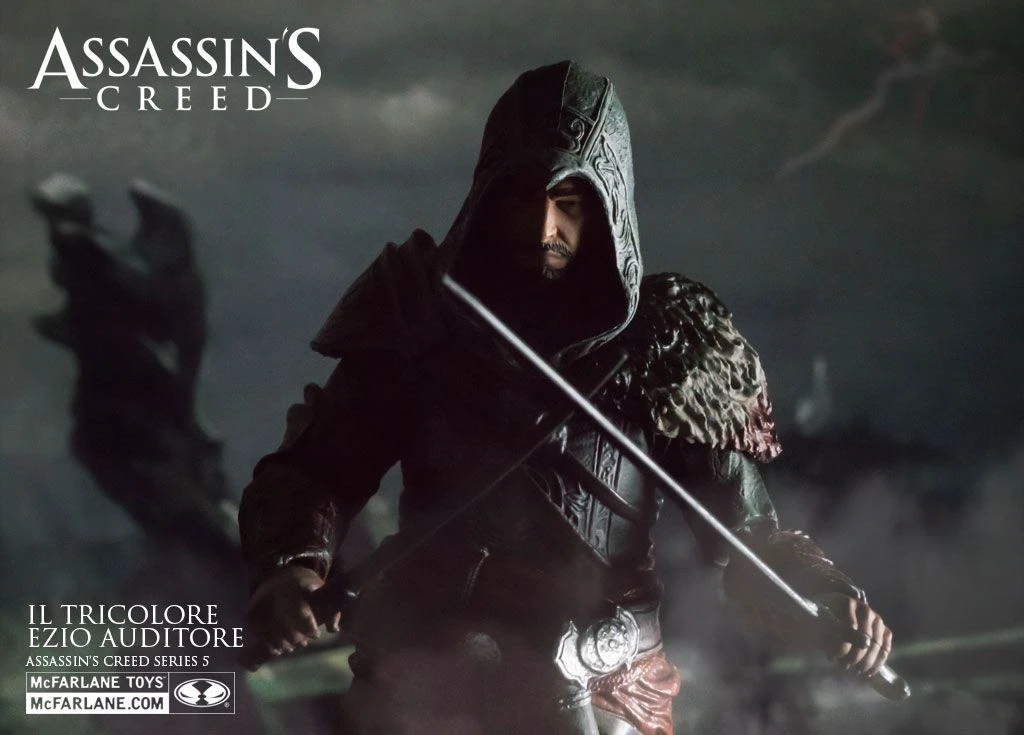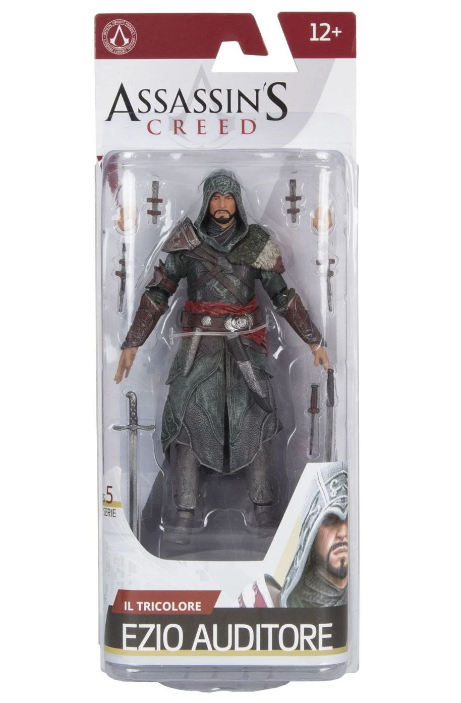 McFarlane Serie 5 Actionfigur von Ezio Auditore in italienischer Tricolore aus dem Videospiel Assassin’s Creed.