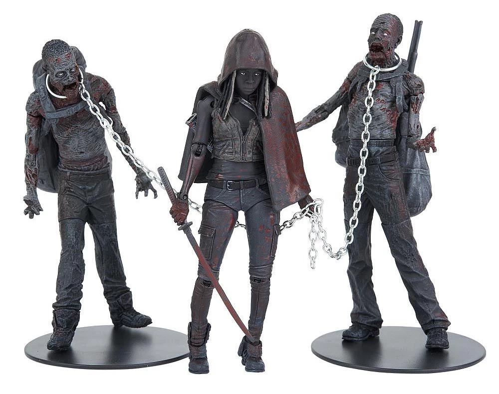Das sehr schöne Set mit Michonne und ihren Walker-Zombie-Haustierchen kommt inklusive dreier beweglicher Figuren, beide Zombies befinden sich auf einer Standbase.